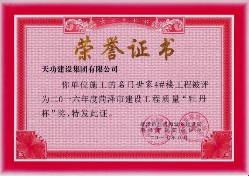 2016年度市建设工程质量牡丹杯奖-尊龙凯时人生就搏建设集团有限公司官网