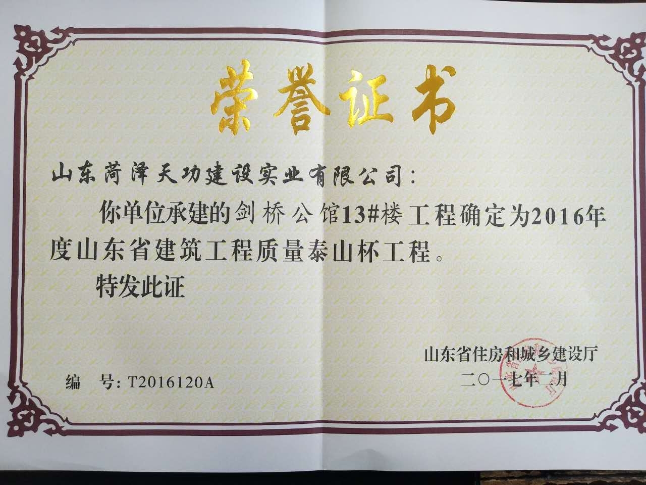 我公司尊龙凯时人生就搏建设集团有限公司承建的剑桥公馆13#楼荣获2016年度山东省建筑工程质量泰山杯工程