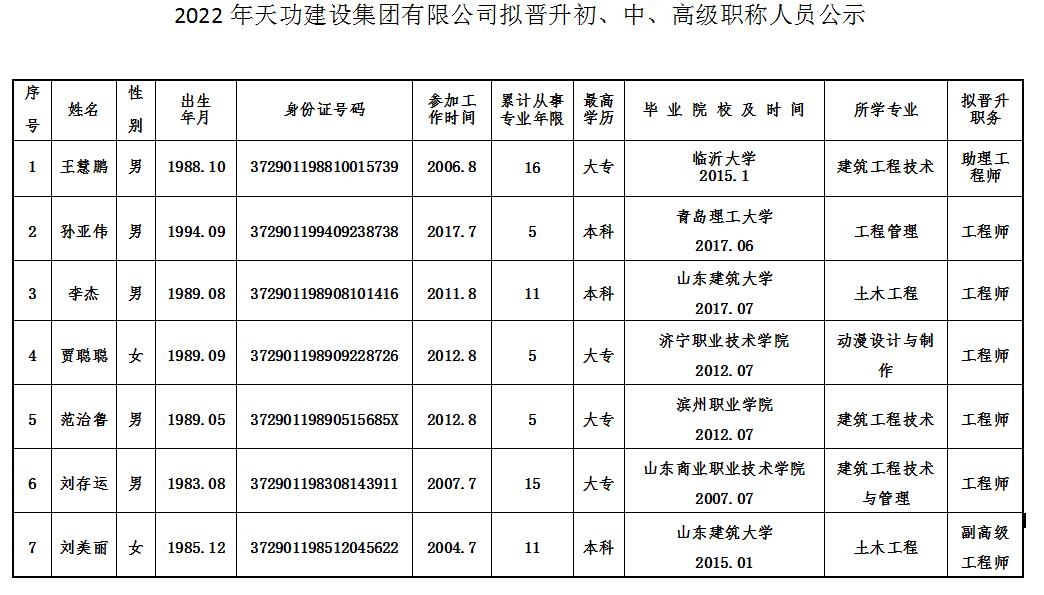 2022年尊龙凯时人生就搏建设集团有限公司拟晋升中级职称人员公示